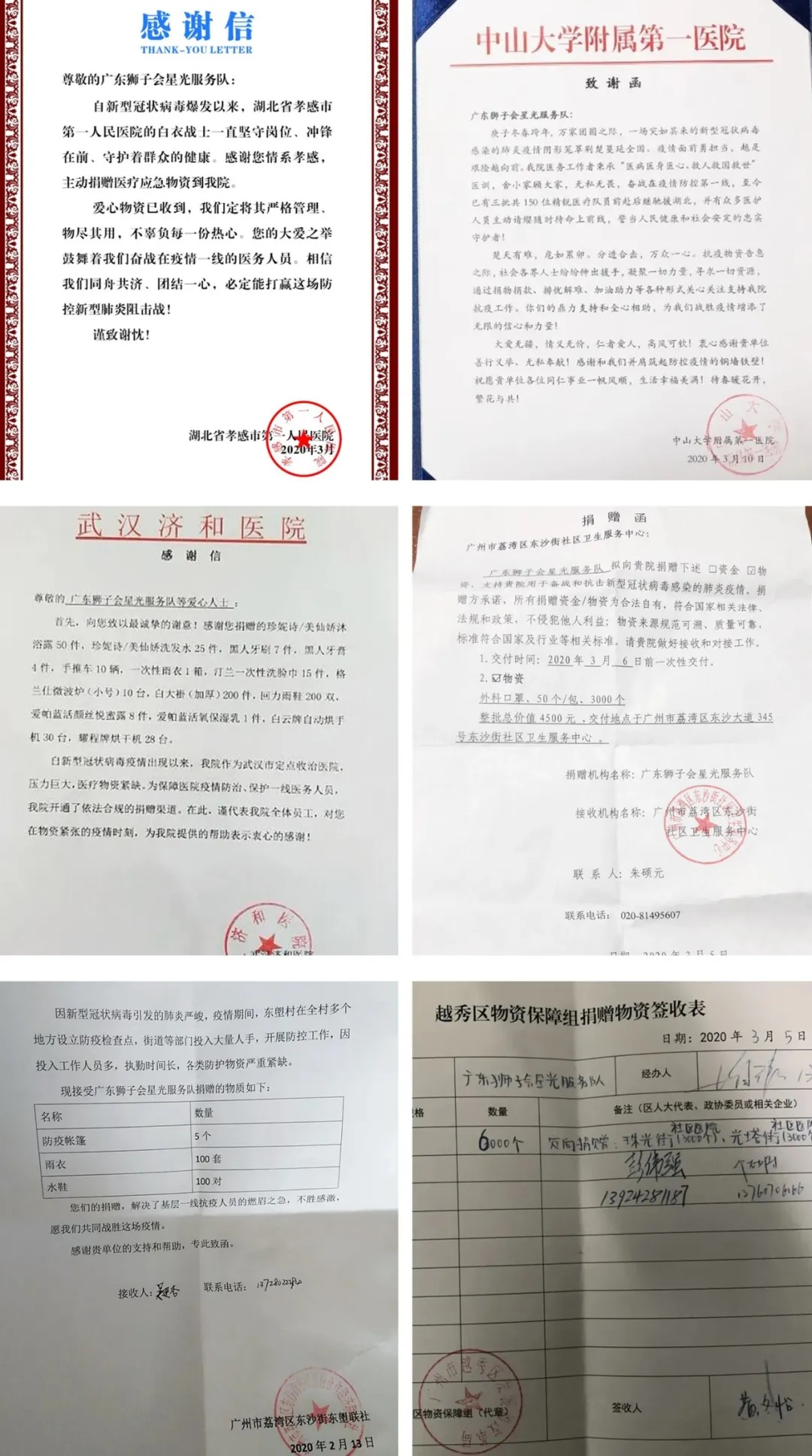 2020年伊始,我们共同度过了一个不同寻常的春节。疫情面前没有旁观者,看着医务人员、社区工作者的义无反顾,毅然投身防疫第一线,星光服务队一众会员备受鼓舞,纷纷投入到疫情防控工作中。 由于疫情正值春节期间,很多工厂尚未复工,星光服务队发动一切力量:在国外寻找物资,完成采购、验货、货运、清关等一系列流程;在国内积极联系厂家复工......大家尽最大的努力,把紧缺的口罩、防护服、消毒水、防护手套、临时帐篷等各种紧缺的抗疫物资送到疫情防控第一线。截至目前,星光服务队已向各一线抗疫部门捐赠总价值超过20万元的物资。 筹集物资,助力东塱社区疫情防控工作 疫情期间,广州市荔湾区东塱联社辖区社区工作人员需要在防护物资严重紧缺的情况下,在社区开展疫情防控工作。星光服务队得知后,立即发动队员行动起来,四处联系相关供应商,克服停业、运输等各种困难,紧急把100套雨衣、100套水鞋捐赠到东塱联社,支持社区防疫工作。 2月5日,东塱联社辖区发现一宗待确认新型冠状病毒肺炎,但因社区内还没有隔离区,待确认患者只能在工作检查岗里等候救护车的到来。针对此情况,星光服务队筹集了5顶临时帐篷,让社区工作人员能够迅速布置隔离区,供疑似患者使用。 捐赠医用防护品,助医务人员抗击疫情 受疫情影响,省内多所医院需要在确保安全的情况下开展接诊工作,并组织援鄂医疗队,防控压力巨大,物资极度紧缺。了解情况后,星光服务队积极联系厂家,为中山大学附属第一医院捐赠了40000个医用外科口罩,缓解医务人员燃眉之急。 此外,星光服务队还向广州市越秀区光塔街社区卫生服务中心、越秀区珠光街社区卫生服务中心、荔湾区东沙街社区卫生服务中心各捐赠3000个一次性医用口罩,协助基层医护人员有效遏制疫情在城乡社区的扩散和蔓延,共同织起疫情防控的社区防线。 感召生活用品 消除湖北抗疫医务人员后顾之忧 由于湖北省各城市封城的原因,当地生活用品告急。获悉情况后,星光服务队感召多家爱心企业,筹集洗发水、沐浴露、牙膏、牙刷等近10万元的生活用品捐赠到湖北省孝感市第一人民医院、武汉济和医院,为一线医务人员消除后顾之忧。 一方有难,八方支援,一根红线贯穿,颗颗红心相连。感谢星光全体会员的拳拳爱心,无私奉献,感谢爱心企业与爱心人士对星光的支持与信任。广州的春天如期而至,木棉花早已盛开,期待疫情过后,我们继续携手,继续谱写公益服务的新篇章。 各受赠单位发来的感谢信、签收证明