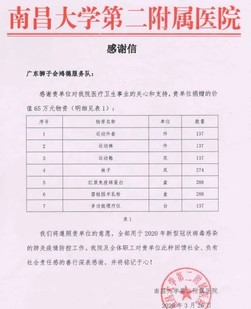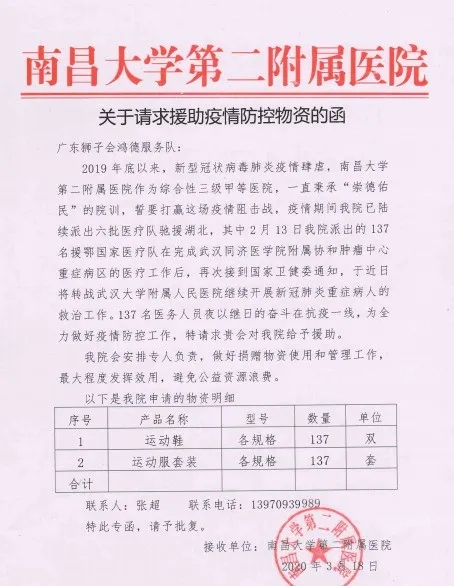 白衣执甲斩病魔,不获全胜不收兵!3月17日下午,完成武汉华中科技大学同济医学院附属协和肿瘤中心援助任务的南昌大学第二附属医院抗击新冠援武汉国家医疗队再次接到国家卫健委指令,稍作休整后再次出征。本来准备踏上归途的江西援鄂医疗队已经把工作服作烧毁处理,当收到留驻当地的指令时,南昌大学第二附属医院援武汉国家医疗队立即向广东狮子会鸿德服务队发函,请求援助工作服等疫情防控物资。 南昌大学第二附属医院《请求援助疫情防控物资的函》 收到请求函后,鸿德服务队在现任队长姜永的带领下,紧急筹集到137套工作服、137台多功能理疗仪、288罐免疫球蛋白、288罐羊乳粉等一批总价值约65万元的物资。该批物资已在第一时间被派发到医疗队医护人员手上。 在鸿德服务队采购工作服的过程中,生产厂家了解到这批服装将被送到援武汉国家医疗队,加班加点为医护人员定制好带有南昌大学第二附属医院标志的工作服,希望让医护人员穿上以后更加精神。 厂家定制的南昌大学第二附属医院援助武汉国家医疗队工作服 南昌大学第二附属医院院办负责人表示:“衷心感谢鸿德服务队携手多家爱心企业、公益团体共同筹划本次极具意义的捐赠活动,前线医务人员将继续全力以赴,抗击疫情,不辜负社会各界对我们的期望!” 南昌大学第二附属医院向鸿德服务队发来的感谢信