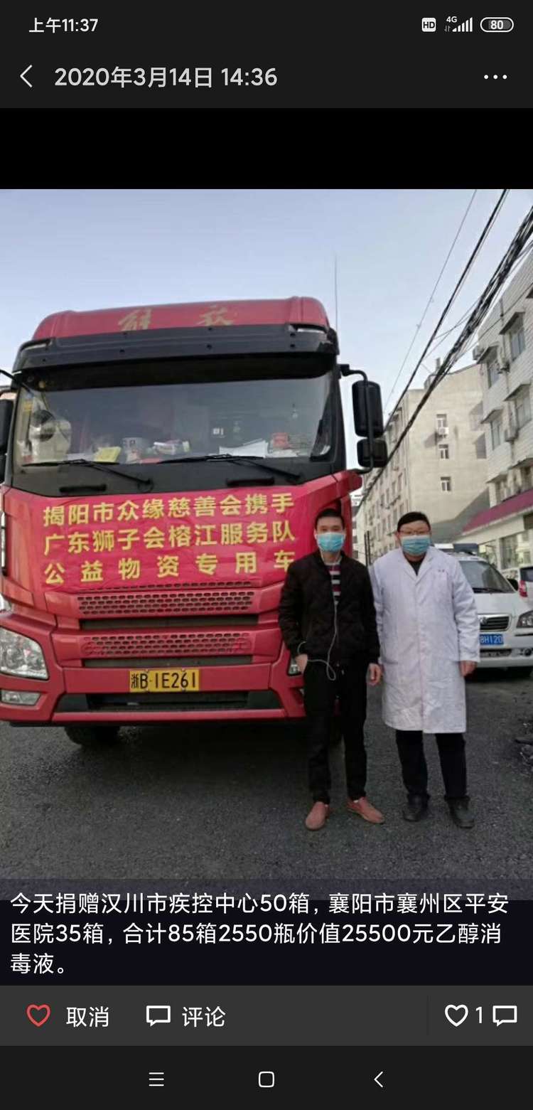 2020年初,“新冠”肺炎疫情突袭中国,湖北成为了这次疫情的重灾区。疫情期间,湖北省残疾人联合会二级巡视员杨丹珠负责协调对接狮子会及其他爱心企业、团体的募捐工作。杨丹珠回忆道:“全国狮子会会员共为湖北捐款153.99万元,捐赠物资价值726万多元,其中,广东狮子会为湖北捐款30万元,捐物价值高达500多万元,为湖北打赢防疫阻击战作出了重要贡献!” 以下,是杨丹珠携手各地狮子会与各爱心企业的抗疫故事: 冬去东风浩然,春暖花开正气。 时隔76天,我们一起期待的这一天终于来到了!武汉这座英雄的城市终于重启播放器,浴火重生! 灯火霓虹中,回想庚子大疫,举国奋争,英雄辈出,湖北人民可歌可泣。让我们回首仰望封城这76天里闪现眼前的身影…… 在大疫大难面前,在武汉这座英雄之城,每个人都在努力以自己的真心、无畏、正直和付出,助力打赢这场疫情防控的人民战争。这里不仅有以身犯险冲到最前面的“最美逆行者”,用生命诠释生命的意义,用英雄的行为拯救这座同样英雄的城市!还有全国人民在党中央一声令下驰援湖北,驰援武汉;还有在我们身边默默付出的人民警察、社区工作者、志愿者、下沉干部等等战士的身影,同样在同舟共济,共克时艰,竭尽所能帮助他人,勇敢承担对抗疫情的具体工作。更多的是虽然没有站在战斗最前线、但响应号召家门不出、团结一致“闷死”病毒的我们每一个普通人,默默在困境中守望,坚定对美好生活的向往和不胜不休的信心,也都在为这场全民抗击疫情阻击战贡献着自己的力量。 正是在以习近平同志为核心的党中央的坚强领导下,在湖北省委、省政府的部署安排下,在全国人民的大力驰援下,我们才打赢了这场战胜疫情的阻击战、攻坚战! 武汉是一座英雄的城市,也是一座美丽的城市!这里有奔腾不息的浩浩长江、烟波浩渺的大美东湖、驰名中外的黄鹤名楼、令人留连的武大樱花……春回大地,万物复苏,武汉正孕育着无限希望!待病魔退去,武汉定会张开怀抱,欢迎祖国各地的亲人们用闲暇时间来到武汉,登黄鹤、游长江、赏樱花、品佳肴,欣赏江湖山水美景,感受荆风楚韵风情,接受武汉人民最高的礼遇! 忘不了,2020年初的这场突如其来的新型冠状病毒感染肺炎疫情肆虐荆楚大地,牵动着亿万国人的心。中国狮子联会积极践行出心、出力、出席、出钱,正己助人、服务社会的狮子会宗旨,立即发动全国狮友为湖北捐款捐物。按照责任分工,我负责感召协调对接狮子会募捐工作。据不完全统计,全国狮友共为湖北捐款153.99万元,捐赠物资价值726万多元。 中国狮子联会浙江代表处第一个伸出援手,为湖北捐款19.2万元,捐赠30台消毒液自造机,分两批送到了承担外省援汉医疗队接待任务的青山区、江汉区残联、武昌区残联。 狮兄狮姐献爱心,守望相助抗疫情;同舟共济护生命,众志成城有信心。对于全国狮友们的善举,我们致以衷心的感谢和崇高的敬意! 忘不了,广东狮子会为湖北捐款30万元,捐物价值高达500多万元,是捐款捐物最多的狮子会。 1月25日,武汉疫情来势汹汹,武汉市内多家医院因物资紧张,请求社会各界支援。得知这一情况,生活在湖北的广东狮子会楚天服务队黄光渝队长和张丽霞秘书长第一时间在办公会议群中和办公成员进行商议,决定为一线医护人员进行物资捐赠,及时号召狮友和爱心人士捐款,参与疫情物资捐助活动。远在加拿大的贵士利狮兄在捐款号召发起的第一时间捐赠了5000元善款,众多狮友立马开始踊跃捐赠,很多狮友还积极进行朋友圈转发号召爱心人士捐款。邹信成狮兄、王超狮兄自身感染病毒住院治疗、陈涛狮兄疑似感染在家隔离,仍心系抗疫积极捐款。因为大家的捐款热情,会员群和爱心嘉宾群里面的捐款接龙接连不断,爱心基金越来越多,司库孙蓝狮姐认真记录每一笔善款,整个募捐活动一天时间就募集到爱心款项71200元。服务队原计划是打算将善款用来购买物资,以物资的形式捐赠到医院,但因为身处武汉,防疫物资稀缺,也没有畅通的物资供应渠道,多方资源也只筹得500个医用口罩。因为物流限制口罩只能由狮友驾车取货,楚天服务队秘书长张丽霞在确认口罩所在地后只身前往约定取药点,因为种种原因,张丽霞狮姐仅取得了145个口罩。这来之不易的145个口罩最后由楚天服务队秘书长张丽霞驾车送往湖北省中医院光谷院区,虽然物资不多,但医院仍表示很感谢。 楚天服务队剩余善款68300元,3万元委托广东狮子代购防疫物资,向湖北慈善总会捐赠3.83万元人民币,并积极联系争取广东狮子会向湖北鄂州市、黄冈市黄州区、崇阳县、汉川市、广水市等地医护用品急需的基层医院捐赠相关防疫物资,联系广东商会筹措了30多万善款,捐给武汉广东商会的潮粤香酒楼,每天做1000份盒饭送给协和、新华中心等医院的医护人员就餐,彰显了狮友们的大爱精神,为湖北打赢防疫阻击战作出了重要贡献! 广东狮子会为汉川市人民医院、汉川市妇幼保健院捐赠抗疫物资 广东狮子会为英山县妇幼保健院捐赠抗疫物资 广东狮子会为湖北捐赠抗疫物资 揭阳市众缘慈善会、广东狮子会榕江服务队、广东狮子会楚天服务队为湖北捐赠防疫消毒物资 揭阳市众缘慈善会、广东狮子会榕江服务队、广东狮子会楚天服务队为十堰市残联捐赠防疫消毒物资 广东狮子会为黄冈市黄州区人民医院捐赠防疫消毒物资 广东狮子会为