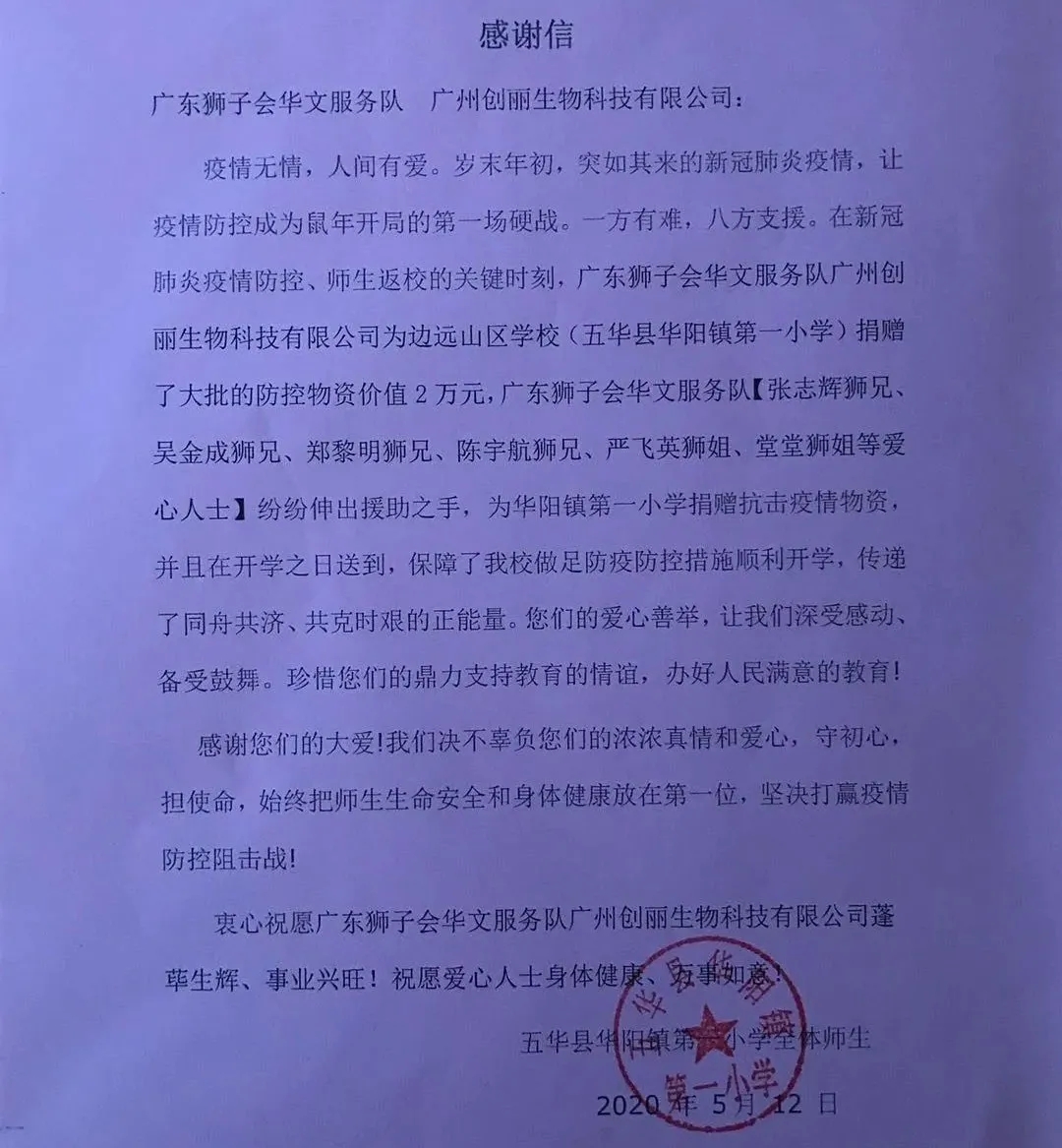 2020年5月11日是梅州市五华县华阳镇中心小学学生返校复学的日子,当天,学生们收到一批由广东狮子会华文服务队联合广州创丽生物科技有限公司捐赠的防疫物资,助力学校安全复学。 当前,新冠肺炎疫情还未完全解除,学校复课防疫物资需求大。自2020年1月起,华文服务队在华阳镇中心小学开展助学服务,持续关注学校师生需求,在了解到学校缺少防疫物资的情况后,华文服务队党员会员积极行动,发动群众会员、社会爱心人士共同参与,筹集口罩2320个、消毒液2200支、测温仪15把等一批防疫物资,用实际行动诠释了“同舟共济、共克时艰”的社会责任。 防疫物资通过快递方式送达学校 口罩在第一时间被派发到学生手上