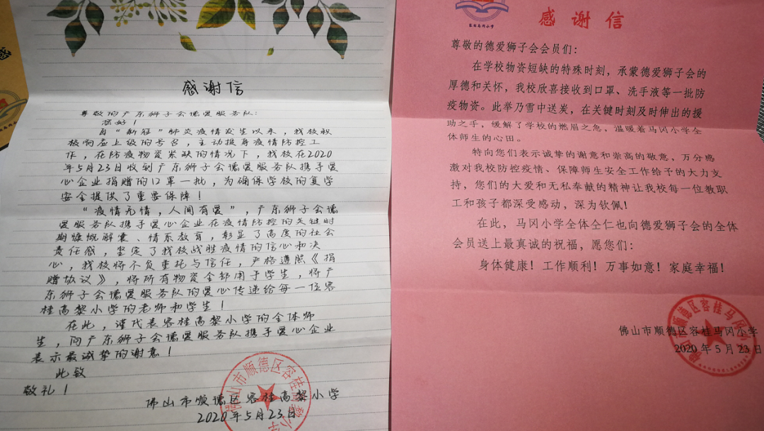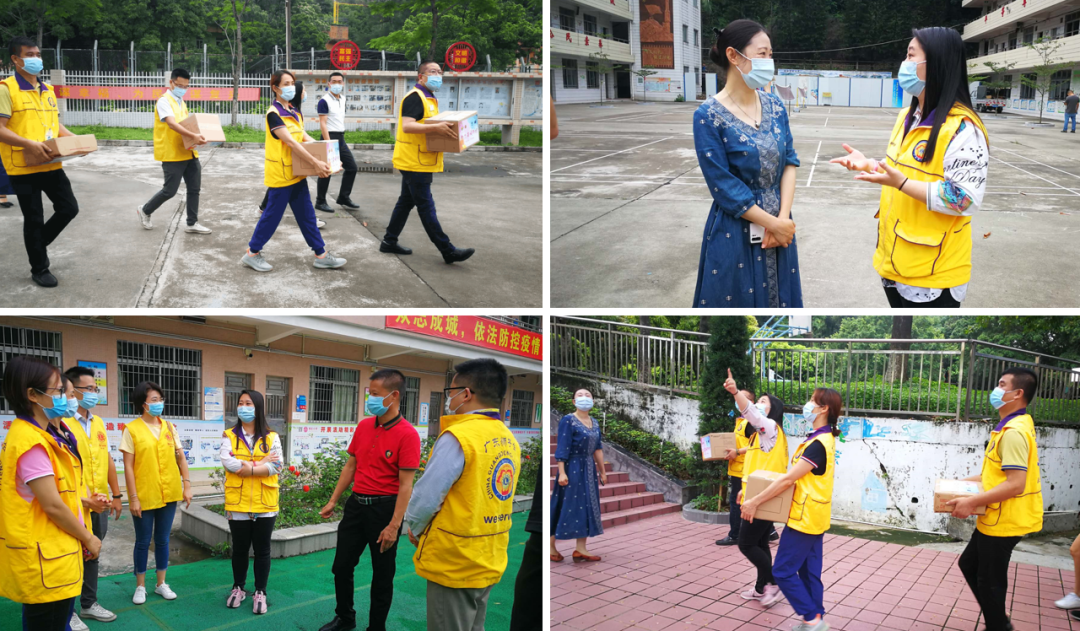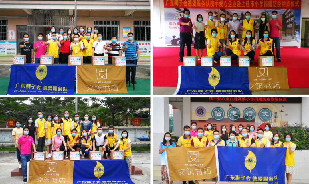 为助力顺德区小学复学复课疫情防控工作,保障校园师生安全,2020年5月23日,广东狮子会德爱服务队联合顺德本土爱心企业文筑书店、高派体育传媒、高派足球俱乐部、佛山力得高科技有限公司开展第二期“关爱校园口罩捐赠活动”,向高黎小学、马冈小学、南区小学、上佳市小学捐赠了共8000个一次性防护口罩、1000支洗手液,总价值1.75万元。