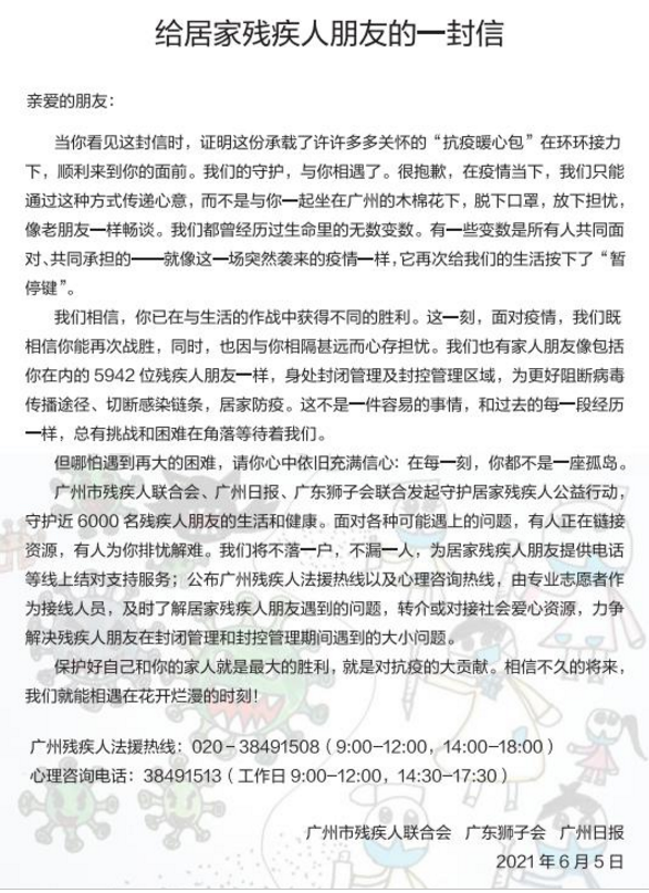 日前,广州日报充分发挥主流媒体桥梁作用,开展“同心防疫为你加油”公益行动,对接区街了解实际需要,联系爱心社会力量开展帮扶,共同为疫情防控贡献力量。为守护管控区域的残疾人朋友,6月初,广州日报、广州市残疾人联合会、广东狮子会发起“守护居家残疾人”公益行动,送抗疫物资、开通咨询和心理支援热线,并力争做到不漏一户,不落一人。 300000只医用口罩、12000支免洗洗手液、6000封慰问信……目前,广州日报携手广州市残联、广东狮子会为荔湾区、海珠区、番禺区管控区域残疾人送出的6000份“抗疫暖心包”已陆续发出,其中4949份于8日下午被开始送往荔湾区,预计将送达管控区域每一位残障人士手中。暖心包中“给居家残疾人朋友的一封信”,以及封面上“云开疫散后 一齐‘叹’早茶”的文字,将温暖他们和家人的心。 孤独症青年纬纬因为身处封闭区,要稍晚才能收到暖心包,但是,他“叹茶”的愿望一样迫切。“纬纬说,疫情结束后,他要去‘叹茶’,吃虾饺、烧卖、糯米鸡……”纬纬妈妈忍不住笑着说,“我相信形势会越来越好,我们也越来越淡定。感谢关爱,大家保重,一起加油,云开疫散再聚首!”
