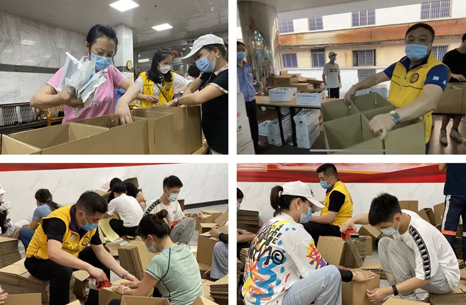 6月8日,记者在位于越秀区的社会助残组织大楼看到,数十名广东狮子会会员及来自社会各界的志愿者自发地前来装车,4949箱发往荔湾的“抗疫暖心包”足足塞满了3辆货车。记者也与顺丰司机一起前往管控中的石围塘街道,运送这批承载着社会各界爱心的礼物。
