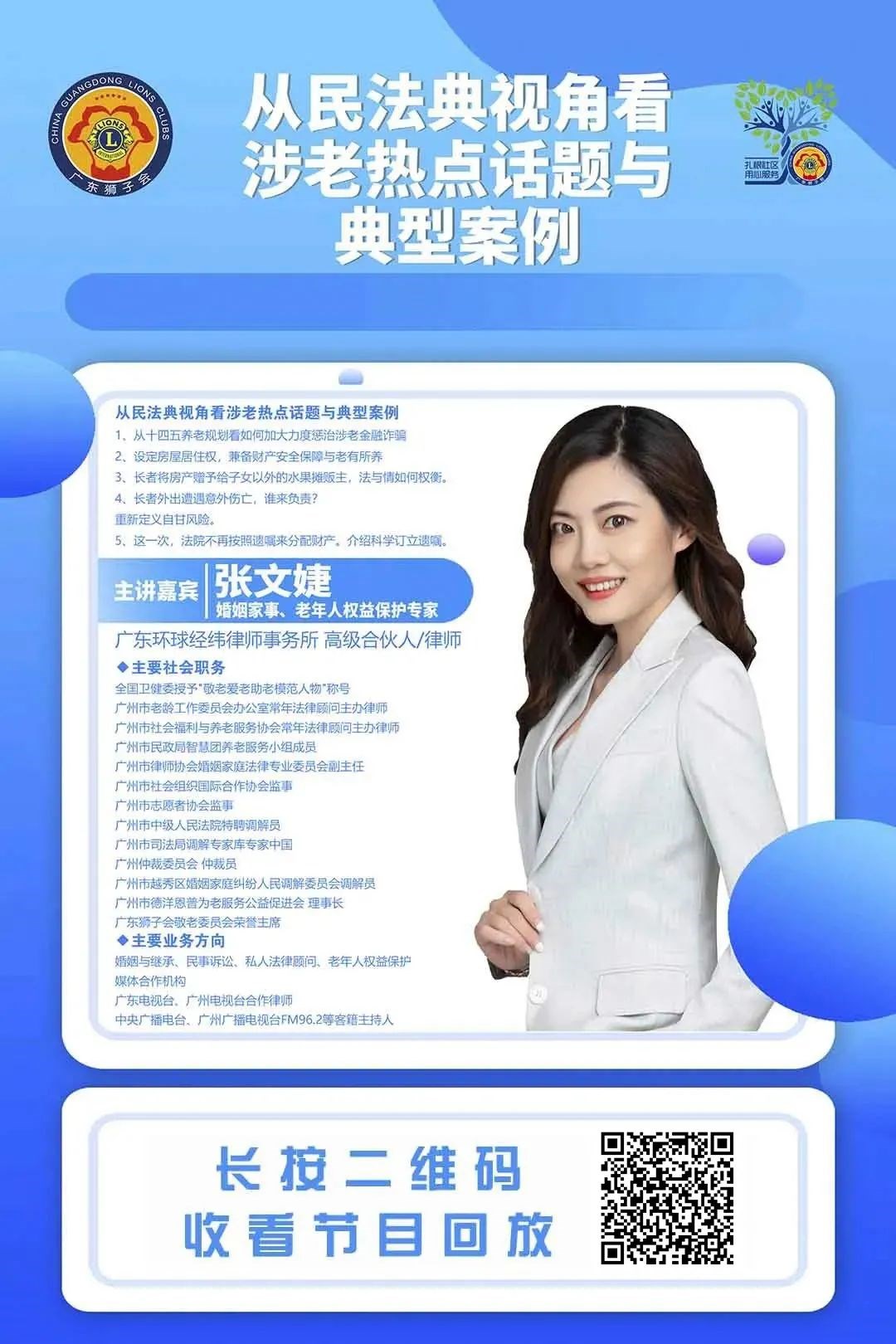课程回放 以下是课程回放 可供个人收看 也可用于长者普法活动 敬请关注 课程介绍 广东环球经纬律师事务所高级合伙人/律师 全国卫健委授予“敬老爱老助老模范人物”称号 广州市德洋恩普为老服务公益促进会理事长 广东狮子会敬老服务委员会荣誉主席