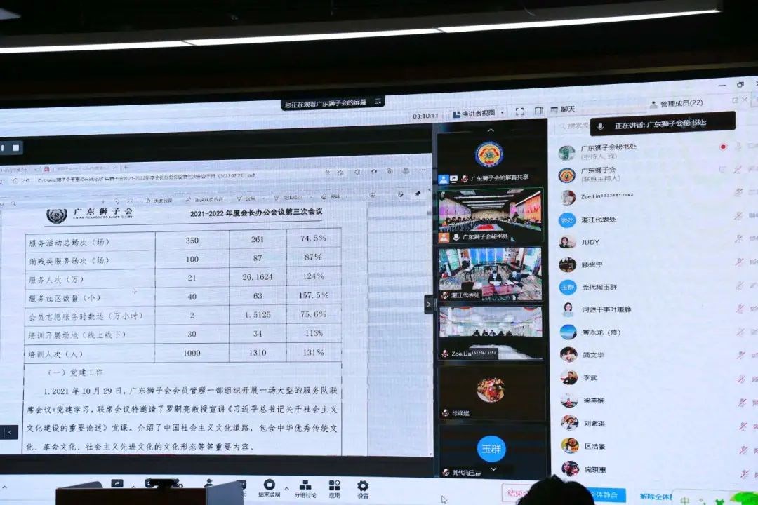 图为线下会议现场 图为线上会议 郑子殷会长指出,广东狮子会正以更积极的姿态拥抱国家“十四五”规划,扶残助残与乡村振兴事业稳步推进,财务、会务、法务工作逐步完善,组织公信力、美誉度得到进一步提高。