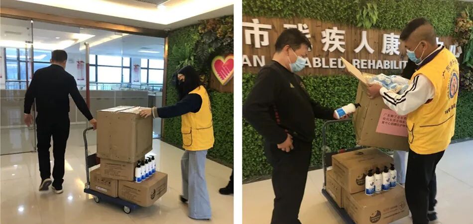 在抗击新型冠状病毒感染肺炎疫情的关键时刻, 全国人民众志成城齐心抗疫,许多爱心单位及个人以高度的社会责任感和强烈的家国情怀加入到这场打赢疫情防控狙击战中来,回报社会,彰显大爱。 2020年4月3日,广东狮子会2019-2020年度东莞代表处主任杨小清、第一副主任卢巨良来到东莞市特殊幼儿中心、东莞市残疾人康复中心,向中心残疾人及残疾人工作者捐赠口罩5000只、免洗消毒凝胶180瓶子,用于支持残疾人工作者做好复工复学准备工作。 杨小清狮姐表示:广东狮子会东莞代表处时刻关心关爱特殊群体。自疫情发生以来,更是时刻关注特殊儿童及残疾人康复机构开展疫情防控工作的情况,希望这批防护物资能更好地帮助残疾人及残疾人工作者,为机构的复工、复学贡献一份力量。