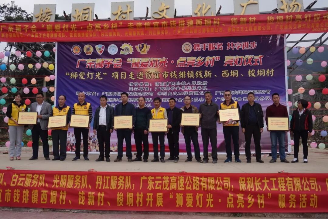 2020年1月2日下午,一场简朴而欢庆的乡村亮化工程建成亮灯仪式在信宜市钱排镇梭垌村举行,50多名会员、爱心人士与当地村民共同见证着村路上的一盏盏太阳能路灯亮了起来。本次“狮爱灯光·点亮乡村”活动由信宜市钱排镇人民政府指导,广东狮子会粤旗服务队主办,花城明珠、白云、光明、丹江服务队、广东云茂高速公路有限公司、保利长大工程有限公司、广东通筑交通科技有限公司联合协办,广东狮子会为当地西垌村、钱新村、梭垌村捐赠了60套太阳能路灯,总价值20多万元,照亮了当地一万四千多名居民回家的路。 信宜市钱排镇人大主席骆峰、钱排镇副镇长邱大浩、副镇长潘标、广东云茂高速公路有限公司总经理助理朱舒,保利长大公司云茂高速公路九标书记佘亚,广东通筑交通科技公司总经理余奋亿、粤旗服务队现任队长冯庆忠、白云服务队现任队长林永强、光明服务队现任队长陈升长等领导、会员、爱心人士参加了本次活动的亮灯仪式。当晚,会员再次沿路查看近5公里长的乡道,了解狮爱路灯的使用情况。看着原本漆黑的村路被一盏连着一盏的路灯照耀着,会员嘴角上都露出了笑容,这是我们为乡亲们做到的一件很实在的事情。 广东狮子会为当地捐赠狮爱路灯