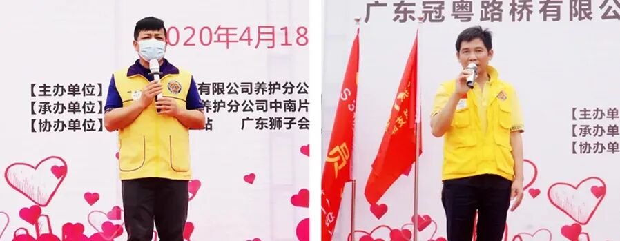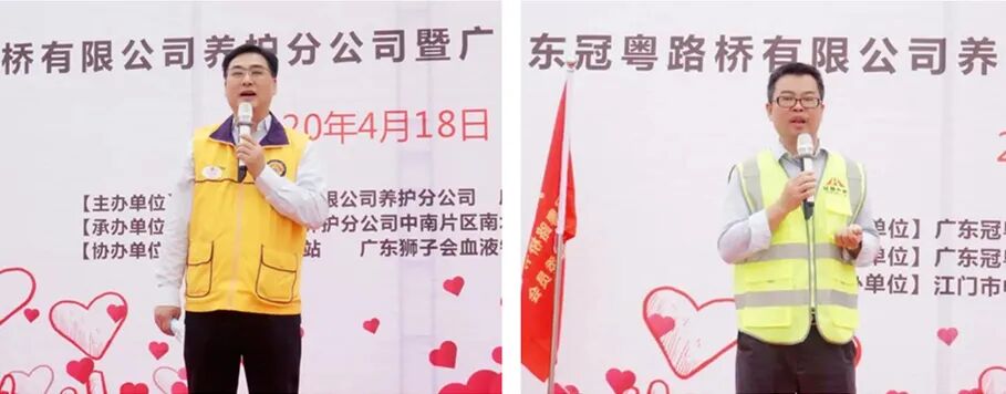 受疫情影响,广东省各地无偿献血采集工作受到严重影响。2020年4月18日上午,“抗疫献血传爱心·养桥护路筑坦途”江门台山站无偿献血活动在广东冠粤路桥有限公司养护分公司中南片区南北养护基地举行,广东狮子会继续携手爱心企业广东冠粤路桥有限公司养护分公司,以点滴热血汇聚成抗击疫情的暖流。 本次活动由广东冠粤路桥有限公司养护分公司(下文简称“冠粤养护”)、广东狮子会联合主办,广东冠粤路桥有限公司养护分公司中南片区南北养护基地(下文简称“南北基地”)、粤旗服务队承办,江门市中心血站、血液银行委员会、唐人服务队协办。活动由粤旗服务队队长冯庆忠担任大会主席、唐人服务队第二副队长杨帆担任执行主席。江门市中心血站站长卢岑、广东狮子会2019-2020年度会长詹晓阳、冠粤养护总经理谢海超、副总经理吴仕高、副总经理廖荣宁、总经理助理曾祥云、南北基地经理徐军、广东狮子会纠察长程兆焱、副秘书长盛振红、江门代表处主任钟达荣、全球服务团队统筹委员会(GST)副主席陈世君、血液银行委员会陈伟等领导、会员、企业及血站骨干代表出席指导本次无偿献血活动。 广东狮子会会长詹晓阳(左)、冠粤养护总经理谢海超(右)
