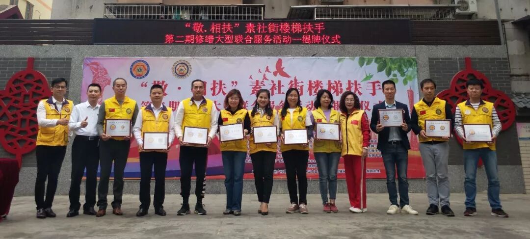 为创造更加安全的生活环境,降低社区长者上下楼梯发生跌倒的几率,促进长者走出家门参与社区活动,2020年1月6日,广东狮子会携手广州市启创社会工作服务中心及多家爱心企业,在广州市海珠区素社街道举行“敬·相扶”素社街楼梯扶手第二期修缮项目,为35栋旧楼加装安全扶手。 本次服务由广东狮子会生命之光服务队主办,广东狮子会社区委员会、岭南、正和、和道、心连心、粤明、白云、同心、扬帆、中湛、孝天下、养心、启舞生命、明德、四季、中清、金狮、方舟、凤城等服务队共同参与。活动由陈智冬狮兄担任大会主席,陈升长狮兄担任主持人。海珠区残联理事长陈武书、素社街道党工委书记舒辉、素社街道办事处副主任杨文雄、广东狮子会2019-2020年度会长詹晓阳狮兄、第二副会长郑子殷狮兄、全球服务团队统筹委员会(GST)主席杨建炜狮兄、广州第三代表处主任梁敏宁狮姐、社区委员会主席刘婉媚狮姐、狮企联谊委员会主席王伟莉狮姐、广州第三代表处第一副主任吴奕明狮兄等会员出席本次活动。 詹晓阳会长与会员一行对爱心扶手进行验收 活动仪式上,广东狮子会第二副会长郑子殷狮兄表示:广州还有很多像素社街一样的老城社区,当地很多旧楼难以安装电梯,且楼道梯级长度长、倾斜度大,老年人出入稍不小心,就很容易摔倒,需要像“敬·相扶”这样务实、可推广的民生项目。但是,广东狮子会的力量是有限的,需要大家积极动员更多的公益组织、爱心企业共同参与,才能让这些民生项目得到更好的推广,让更多的社区群众受惠。 广东狮子会第二副会长郑子殷狮兄 大会主席陈智冬狮兄(左)、主持人陈升长狮兄(右) 随后,会员与素社街道、居委工作人员、社工、居民对35栋旧楼楼道扶手进行了验收,各验收单位都对扶手的安装情况给予了肯定。 素社街道办为广东狮子会赠送锦旗 为广东狮子会各联合服务队颁发感谢状 自2019年年初以来,广东狮子会积极联动社区社工、爱心企业等社会力量,多次走访素社街道,了解到素社街共有476栋旧楼有安装安全扶手的需要,截至目前,已先后举行两期“敬·相扶”活动,为素社街67栋旧楼加装扶手,惠及过千户居民,受到了街坊们一致好评。 活动现场还进行了文艺表演、义诊活动 目前,素社街还有300栋左右的旧楼需要加装安全扶手,广州还有很多老城社区同样需要像素社街“敬相扶”这样的民生项目。广东狮子会期待与您携手,共同为街坊们实实在在地做一些事情,让社区变得更美好!