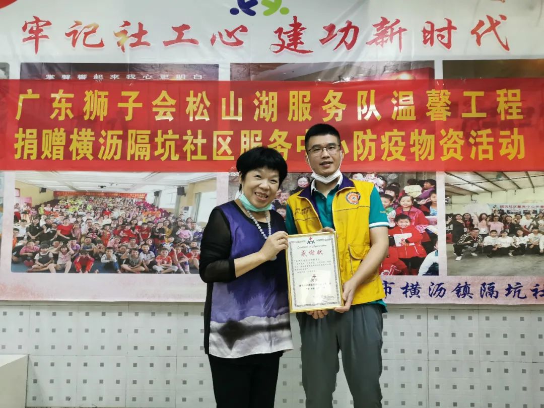 疫情之下,东莞社工作为社区专业力量之一,每天投身到入户探访、卡点执勤、宣传普查、困难人群关怀照料等各项社区服务,在连续100多天的战“疫”一线上,为筑牢社区防线贡献了自己最大的力量。 为助力社区共同夺取疫情防控阻击战的最终胜利,2020年4月26日上午,广东狮子会松山湖服务队在大会主席刘乐浩的带领下来到横沥镇隔坑社区服务中心(下文简称“隔坑社工”)“温馨工程”工作站,为隔坑社工带来免洗洗手液100支、喷雾酒精200支、洗手液12支、84消毒液6瓶 、医用口罩1000个等一批防疫物资。东莞代表处第八分区主席宋玲、松山湖服务队现任队长李春花等10多名会员、爱心人士参与了本次服务。 松山湖服务队向隔坑社工捐赠防疫物资,本次是疫情期间松山湖服务队针对隔坑社工开展的第二次捐赠活动 本次是松山湖服务队第二次向隔坑社工捐赠防疫物资(第一次抗疫物资捐赠活动详情:助力东莞社工 情暖战“疫”一线)。活动中,横沥镇隔坑社区服务中心总干事谭翠莲向大家介绍了服务中心的主要项目以及防疫工作。刘乐浩狮兄表示:“感谢隔坑社工在疫情期间坚守一线岗位,持续关注、服务社区中的弱势群体!” 隔坑社区服务中心总干事谭翠莲为松山湖服务队赠送感谢状 下一步,松山湖服务队将继续支持隔坑社工,关注当地服务对象需求情况,为当地服务对象提供合适的服务,共同为社区居民构筑社会支持网络,通过“狮子会+社工”的结合,让社会服务更有温度!