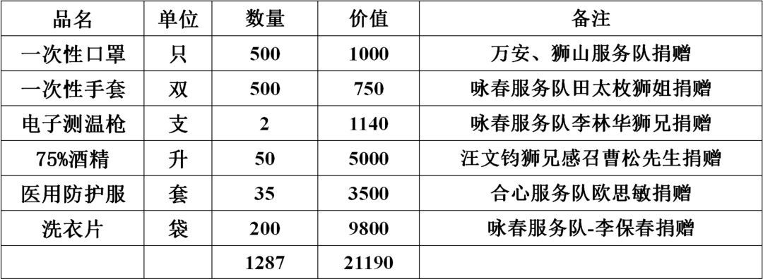 自“新冠肺炎”爆发以来,受疫情的影响,佛山市内多所残疾人康复机构临时关闭,部分残友的康复治疗被迫暂停。2月27日,广东狮子会佛山代表处主任团队在得知这一消息后,立即发起感召并组织开展了“共同抗疫——助残复工”联合服务。 佛山市残联副理事长曹泽润、佛山代表处主任李建军狮兄、全球服务团队统筹委员会(GST)主席杨建炜狮兄、佛山代表处第二副主任麦耀棠狮兄、狮山服务现任队长胡展超狮兄、咏春服务队现任队长汪文钧狮兄等领导、会员及康复机构工作人员、爱心人士参与了本次捐赠活动。 佛山市残联副理事长曹泽润出席本次活动 在收到感召的第一时间,咏春、飞鸿、万安、狮山、合心服务队立即行动,迅速于2020年3月1日,将筹措到的一次性医用口罩、一次性医用手套、电子测温枪、75%酒精、84消毒液、医用防护服、洗衣片等价值21190元的抗疫防控物资捐赠于佛山市残疾人联合会,委托市残联移交于各康复机构,支持各基层单位的疫情防控工作,助力各康复机构早日恢复正常运转,以重启对残友们的康复治疗。 麦耀棠狮兄向佛山市残联移交抗疫防护物资 捐赠物资清单 佛山市新希望康复中心王瑞娟老师作为接收代表现场签收了防疫物资,她激动地说道:“现在防疫物资十分短缺,很难在市面上采购,十分感谢广东狮子会会员,化解了我们的燃眉之急。康复中心全体职工一定会继续发扬朴实作风,不负信任、坚守使命,与残疾人朋友一起打赢这场疫情防控阻击战。” 最后,佛山市残联副理事长曹泽润代表佛山市残联充分肯定了佛山代表处会员在扶贫、助残、疫情防控等多方面的服务成果。他鼓励并期许:佛山代表处党员、骨干会员在当前形势下要勇于担当,发挥先锋模范作用,团结一切可以团结的力量,齐心协力把防控工作做好,进一步把助残工作做得更加持久、扎实,为建设中国特色的社会主义这一伟大事业添砖加瓦。 昨天、今天、明天,我们与历史并肩,相信在全社会的共同努力下,我们的助残事业一定会开展得越来越好。