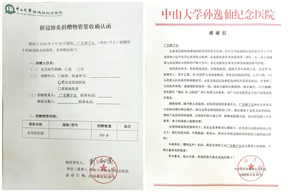 当前国内疫情防控局面持续向好,但形势仍然严峻复杂,面临着反弹的巨大压力。为助力医护人员继续做好疫情防控工作,2020年3月26日上午,广东狮子会一行再次来到中山大学附属孙逸仙纪念医院博济楼前,向一线医护人员捐赠500套医用灭菌防护服。该批防护服由中山华沙利科技有限公司及中山市佳盛丰服饰有限公司联合向广东狮子会捐赠,总价值5万余元。 广东狮子会会长詹晓阳、中山大学附属孙逸仙纪念医院副院长阮毅、广东狮子会秘书长吴强、广州第三代表处主任梁敏宁、广东狮子会监事黄乃钊等会员、医护人员共同出席本次活动捐赠仪式。 活动中,阮毅副院长感谢广东狮子会在特殊时期多次送来医用口罩、防护服、防护眼罩等紧缺物资,在助力医院抗击新冠疫情工作的同时,为充分保护医护人员自身安全、保障医院正常运转提供了有力支持。他充分赞赏广东狮子会志愿者充分发挥模范带头作用,驰援抗疫,勇担重任,并激励广大医护人员不懈怠、不松劲,以更加高昂的斗志投入到救治患者的战斗中。 中山大学附属孙逸仙纪念医院向广东狮子会颁发感谢信 中山大学附属孙逸仙纪念医院发来的物资签收确认函及感谢信 疫情期间,广东狮子会作为社会公益组织,在第一时间行动起来,积极支持前线单位抗疫工作。接下来,广东狮子会将进一步发挥自身优势,积极参与到助力防控疫情、帮扶困难群体等各项工作中。 希望白衣天使在全力以赴救治病患的同时,切实做好自身防护,守护好自己的健康。让我们一起并肩作战、共克时艰,共同夺取疫情防控阻击战的最终胜利!