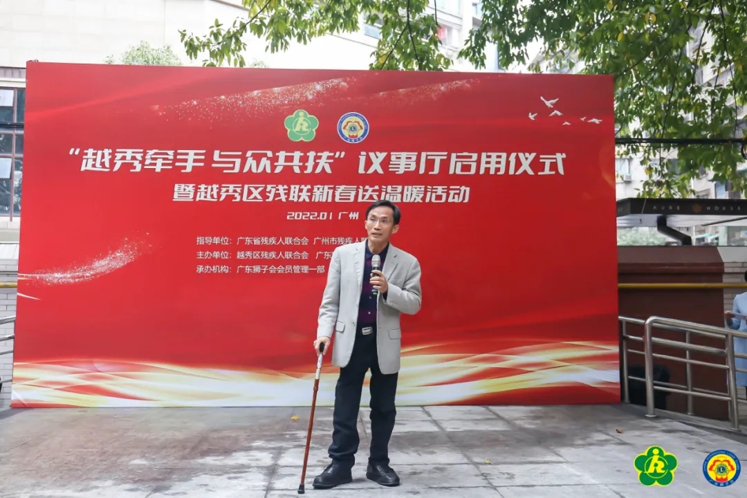 2022年1月23日,“越秀牵手 与众共扶”议事厅启用仪式暨新春送温暖活动在越秀区残疾人联合会(简称“越秀区残联”)举行,广东省、广州市残联,越秀区有关领导出席,残疾人和家属以及广东狮子会志愿者代表参加。 创新助残模式 携手共建残疾人的美好生活 张永安理事长为残疾人派发新春慰问品 陈学军理事长与残疾人亲切交谈 “扎根社区,用心服务”新开始 勇当扶残领域参与式慈善领航者 广东狮子会第二副会长杨建炜介绍:“今年,广东狮子会迎来了组织发展的第二十个年头,同时也是我会和广州市残联、越秀区残联深化合作,共同推进社会力量参与扶残事业的重要一年。这一次,市、区残联给了我们一个很好的服务机会,也不断鞭策着我们扶残工作的优化与升级。” 杨建炜第二副会长 “牵手助残”新升级 各服务队纷纷投身扶残事业