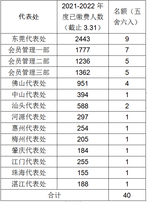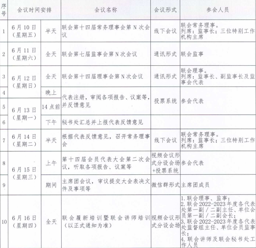 近期,国内多地相继发生聚集性疫情,疫情形势严峻复杂,为落实国家及中国残联相关疫情防控要求,切实保障狮友的健康安全,同时保证中国狮子联会第十四届会员代表大会第二次会议(以下简称大会)的顺利召开,根据《中国狮子联会第十四届会员代表大会第二次会议组织办法》(以下简称《办法》),经中国狮子联会(以下简称联会)第十四届常务理事会研究,决定大会将于2022年6月中旬以视频会议分设会场形式召开。现将有关事项通知如下: 一、时间:2022年6月15日(星期三)上午。 二、大会形式:采用视频形式召开,各地区设分会场。 三、大会及系列会议安排(拟定) 四、广东狮子会参会代表名额 各会员管理部/代表处会员代表名额分配如下: 请各会员管理部/代表处根据名额分配表做好参会代表的推荐提名和遴选工作以及统一组团参会,原则上推荐代表应曾获本会优秀队长或杰出会员奖项,并于5月23日前将参会代表回执表(附件2)报至邮箱。 邮箱:1092281310@qq.com。 五、要求和注意事项 (一)请各会员管理部/代表处遵守疫情防疫政策要求,做好参会的组织及疫情防控工作,保障代表履行职责,准时参会,完成注册、签到及审议表决等工作。 (二)请各会员管理部/代表处积极做好会场安排布置、视频设备调试、投票软件测试等工作。联会将进行至少2次视频会议系统测试联调工作(具体安排另行通知),请各会员管理部/代表处积极协助,按照联会要求,提前做好准备工作。 如有疑问,请与广东狮子会秘书处干事:林子丰。联系电话:83366381-8933 附件:附件1.关于召开中国狮子联会第十四届会员代表大会第二次会议的通知.pdf