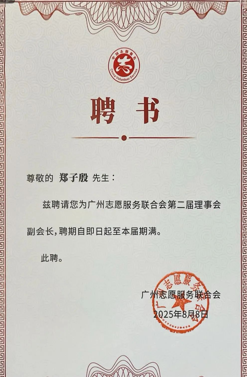 8月8日,广州志愿服务联合会第二届第一次会员大会暨换届大会在海心沙志愿服务主题公园召开。会议审议通过了《广州志愿服务联合会章程》《广州志愿服务联合会第一届理事会工作报告》等,选举产生了新一届理事会成员和新一届理事会会长、常务副会长、副会长、秘书长、监事。市委社会工作部部长、“两新”工委书记沈小革当选为广州志愿服务联合会第二届会长,并代表新一届理事会提出下一步工作思路。其中,广东狮子会前会长郑子殷当选为第二届副会长。 左三为郑子殷 郑子殷 当选广州志愿服务联合会新一届的副会长,郑子殷表示这是一份沉甸甸的责任,也是一份光荣的使命。他将充分发挥自身专业优势与资源,在广州志愿服务联合会的领导下,紧密围绕联合会的宗旨和目标,通过推动志愿服务规范化、传播志愿服务理念、开展特色活动等举措,提升新时代志愿服务能力水平,助力广州志愿服务事业健康有序发展。 聘书 编辑:朱泽忠 责编:张志红