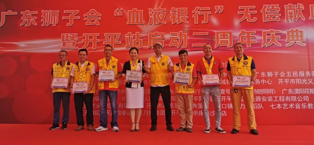 由开平市献血办公室、广东狮子会血液银行委员会、江门代表处主办,长沙镇政府党委单位、开平市残疾人综合服务中心、江门市中心血站、五邑服务队、中江服务队、铁夫服务队、唐人服务队及爱心组织、企业共同协办的广东狮子会“血液银行”无偿献血活动暨开平站启动二周年庆典于2019年10月27日在开平市顺利举行。本次活动由司徒万锋狮兄担任大会主席,李莉狮姐和叶子羽狮兄担任大会主持人,活动通过有奖问答、宣讲等方式向市民群众宣传无偿献血知识,呼吁、鼓励更多人参与无偿献血活动,营造全社会支持无偿献血事业的氛围。