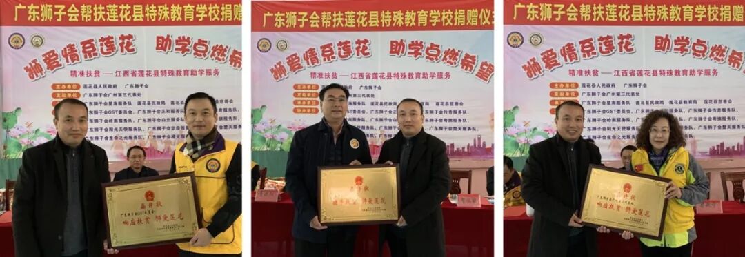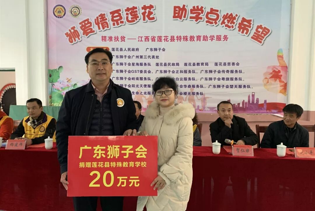 为推动决胜全面小康社会建设和贫困残疾人脱贫攻坚,弘扬扶残助残美德,落实助残共享举措 ,2019年12月24日,在广东狮子会2019-2020年度会长詹晓阳狮兄的带队下,广东狮子会一行赴民政部定点扶贫县——江西省莲花县开展“狮爱情系莲花,助学点燃希望”爱心捐赠活动。 本次活动由莲花县人民政府、广东狮子会为主办,广东狮子会广州第三代表处发起,莲花县民政局、莲花县教育局、莲花县慈善会、广东狮子会星海服务队联合承办,广东狮子会全球服务团队统筹委员会(以下简称“GST”)与岭南、白云、传奇、正和、粤旗、华森、生命之光、橙光、阳光天使、楚天等十支服务队联合协办。莲花县委副书记、县政府副县长陈鲁南、莲花县政府副县长童道雄、莲花县民政局局长彭金强、莲花县残联理事长贺天安、莲花县民政局副局长贺仁斌、莲花县教育局副局长刘小平等领导,GST主席杨建炜狮兄、广州第三代表处主任梁敏宁狮姐、本次活动大会主席钟高见狮兄等会员分别出席有关活动,并沟通交流捐赠事宜。 活动中,广东狮子会向莲花县特殊教育学校捐赠20万元 24日上午,捐赠仪式在莲花县特殊教育学校举行。本次活动,广东狮子会向莲花县特殊教育学校捐赠20万元,用于资助100名残疾儿童入学,支持他们交通、生活、医疗、康复、教育等费用。莲花县副县长童道雄、民政局副局长贺仁斌代表莲花县人民政府及莲花县民政部分别向广东狮子会、GST、广州第三代表处及各联合服务队颁发感谢锦旗和牌匾,感谢广东狮子会各单位对莲花县特殊教育事业的支持。 莲花县政府向广东狮子会、GST、广州第三代表处颁发感谢状