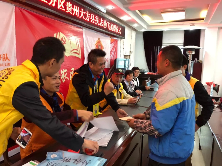 走访结束后,广东狮子会东莞代表处第五分区贵州大方县扶志助飞捐赠仪式分为三个片区在大方县红旗街道办事处、长石镇、马场镇同时举行,来自全县28个乡(镇)、街道办事处的100名贫困残疾儿童获捐,每名儿童1200元,捐助资金共12万元。